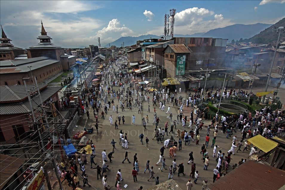 Keşmir’in en büyük kenti olan Srinagar’da toplanan kalabalık, kırmızı, siyah ve sarı bayraklar taşıdı.